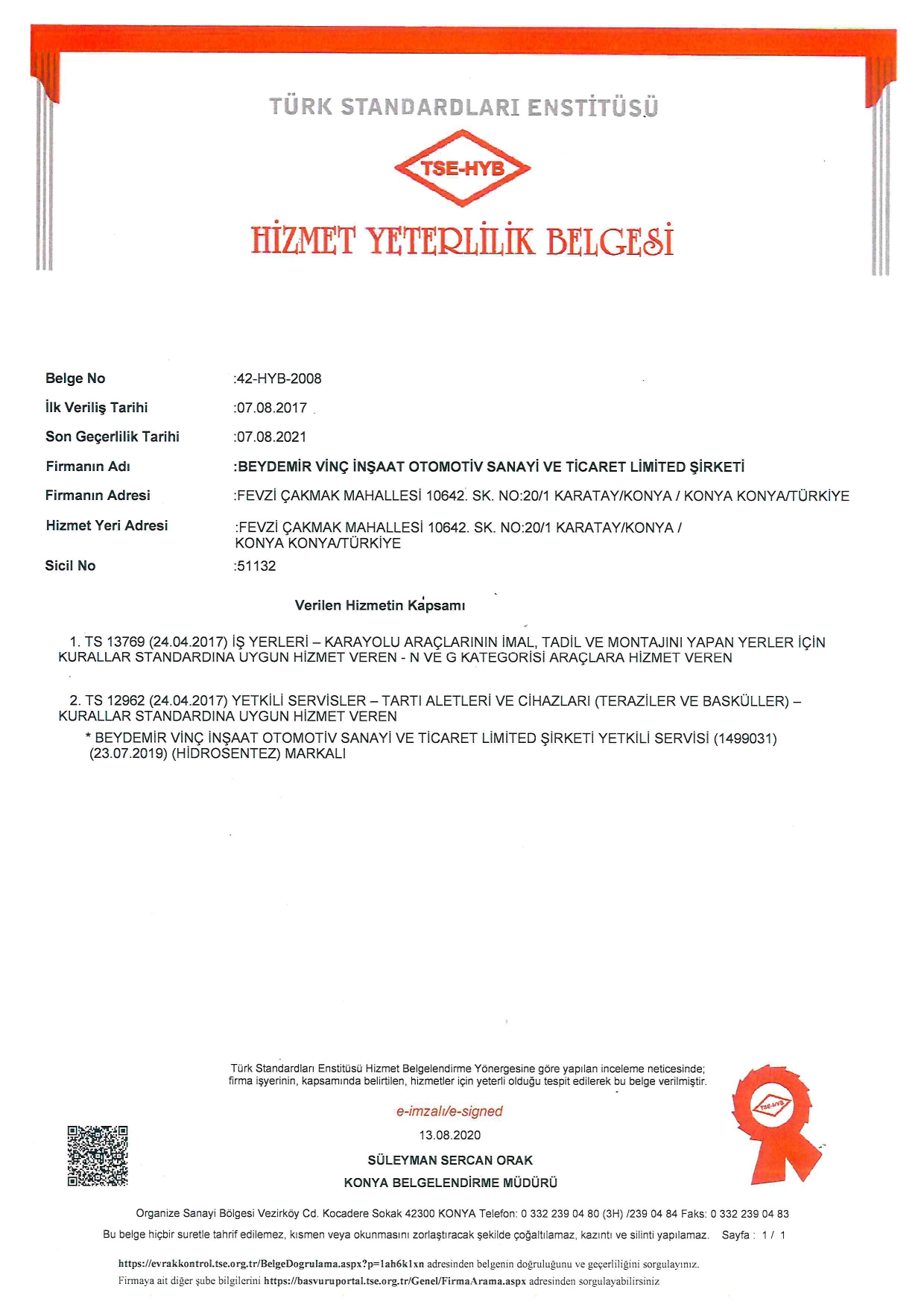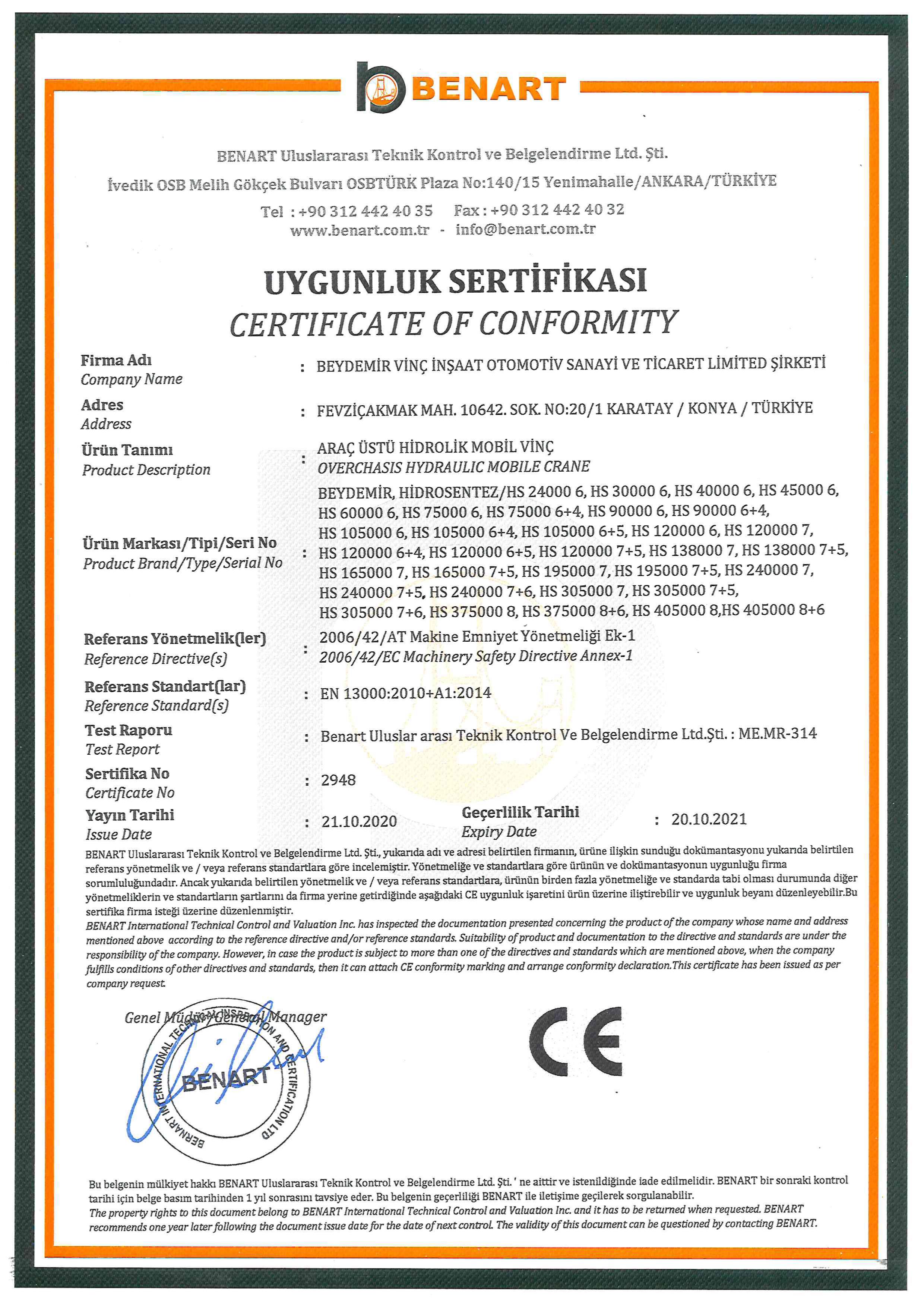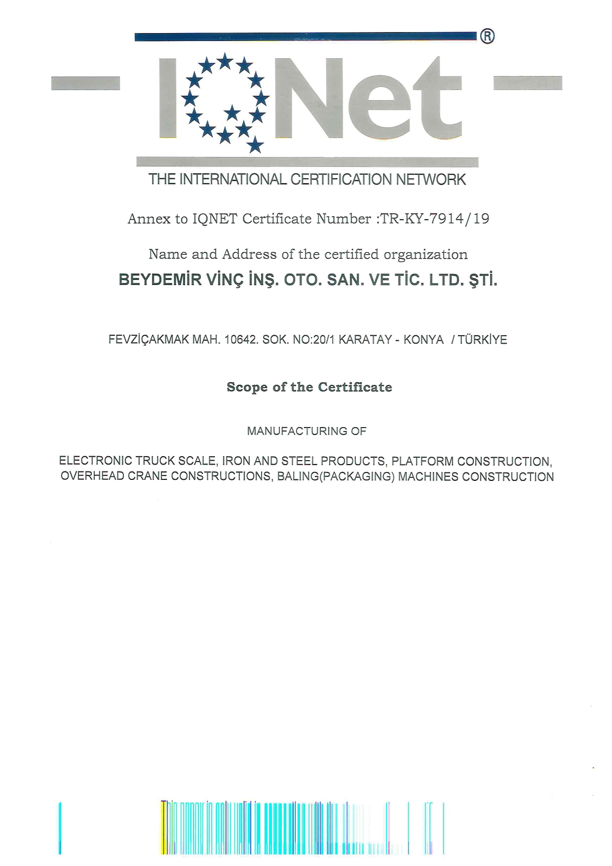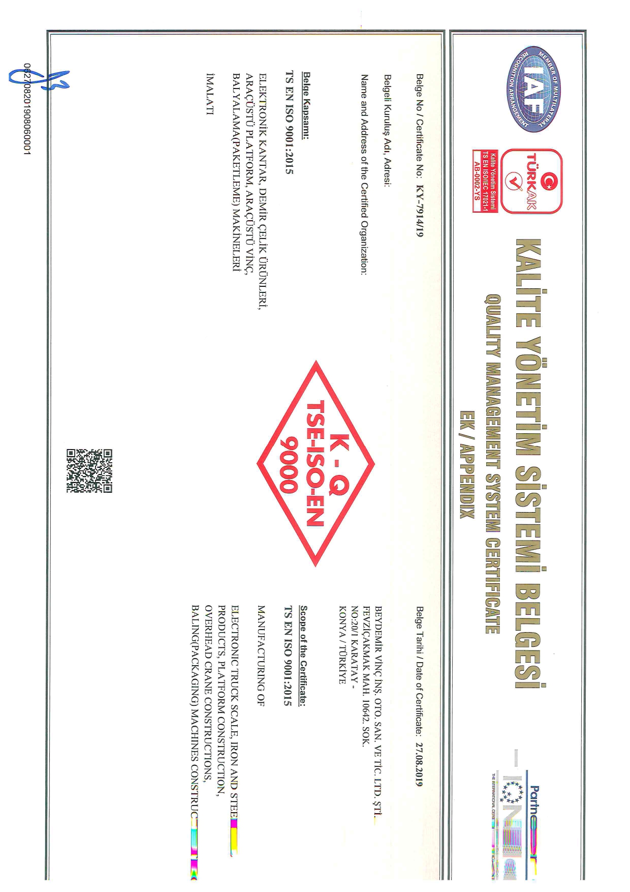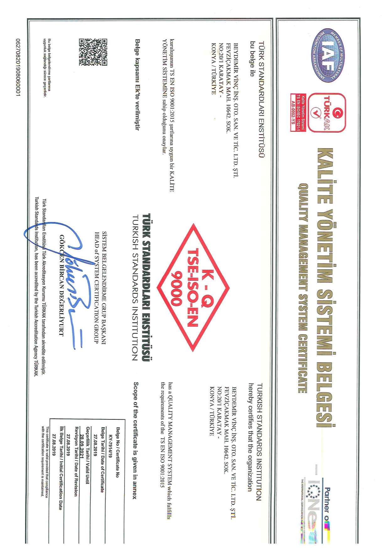 Firmamız kaliteye verdiği önemin göstergesi olarak CE sertifikasına ve ISO 9001-2000 belgesine sahiptir. Ayrıca TSE-EN 12999 Kalite Uygunluk Belgesine \'de sahiptir.